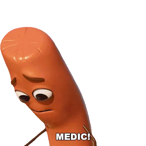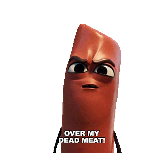 Barry the sausage from Sausage Party Foodtopia, looking angry and determined, declares 'OVER MY DEAD MEAT!'.