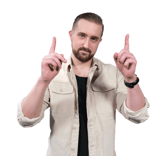 A man points both index fingers upwards, looking directly at the camera with a slight smile.