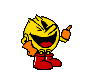 Pac-Man, the iconic video game character, is animated running and moving, wearing his signature red boots and orange boxing gloves.