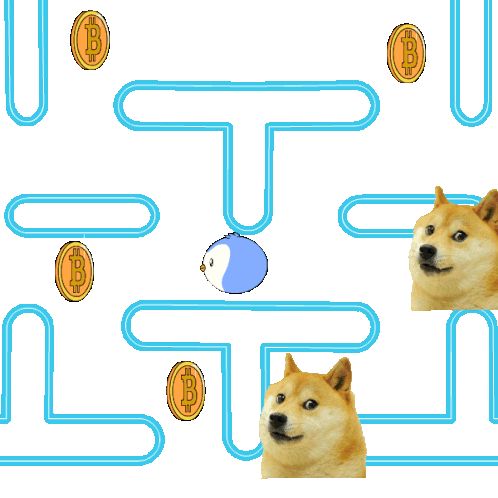a doge and a penguin are playing a game with a maze and coins with the letter b on them