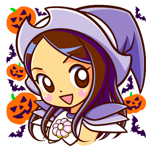Pacottine Emanuelapacotto, a cute anime witch, winks and smiles while holding a pumpkin bucket, perfect for Halloween.