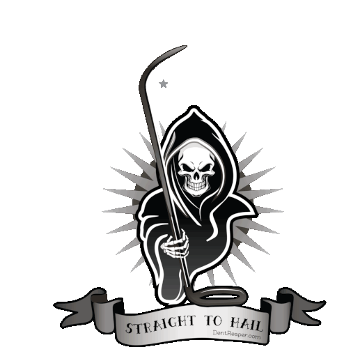Animated sticker featuring grim reaper, chameleon, and angel characters with PDR dent repair tools and slogans.