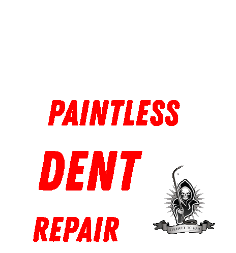 An animated sticker promoting 'PAINTLESS DENT REPAIR' (PDR) with a grim reaper icon holding a dent repair tool.