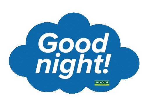 A blue cloud with 'Good night!' and Palmolive Naturals logo, featuring a crescent moon and twinkling stars.