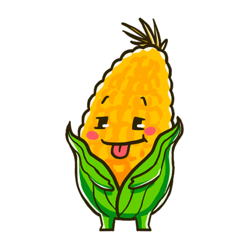 A playful cartoon corn cob, known as Pamonha Milho, winks and sticks its tongue out with a cheeky expression.