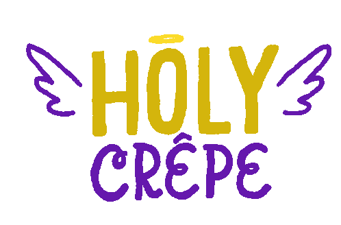 An animated logo for "Holy Crêpe" featuring golden text with a halo and wings, and purple text.