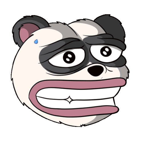 Cartoon panda head with a wide, nervous smile and tired eyes, showing distress.