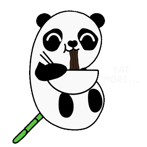 A hungry cartoon panda enthusiastically eats ramen noodles with chopsticks from a bowl.