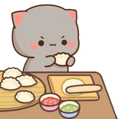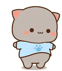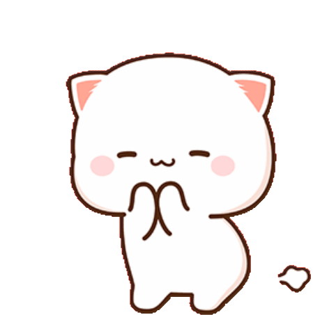 A cute white cartoon cat, known as Peach, with pink ears and nose, expresses happiness or gratitude with clasped paws.