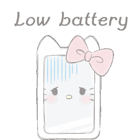 A Pandb cute phone character with a pink bow shows a sad face and a low battery warning.