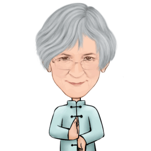 Animated caricature of an elderly woman in traditional attire, greeting and surrounded by Yin-Yang and trigram symbols.