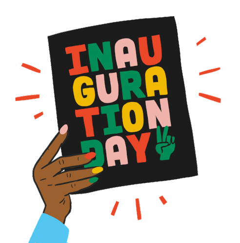 An animated sticker showing a hand with colorful nails holding a black sign that reads 'INAUGURATION DAY' in vibrant letters.
