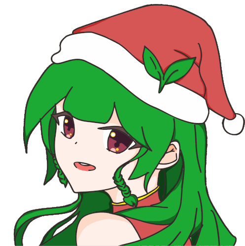 An anime girl with vibrant green hair and red eyes, wearing a festive Santa hat with green leaves, animated with a slight mouth movement.