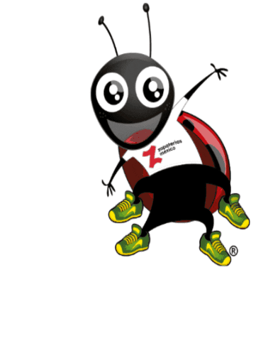 A cheerful Papomex ladybug character, wearing a 'zapaterias mexico' shirt and four green sneakers, ready to move.