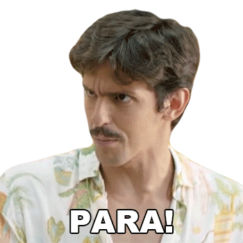 Brazilian actor Rafael Infante from Porta Dos Fundos, with a mustache and floral shirt, exclaims 'Para!' (Stop!).
