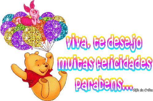 Winnie the Pooh and Piglet celebrate with glittery balloons, wishing 'Parabéns' and much happiness.