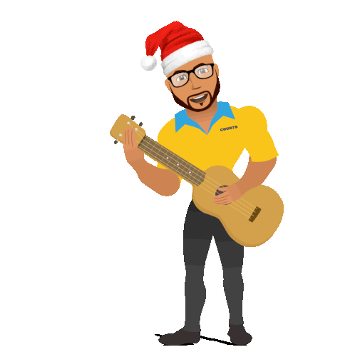 An animated man wearing a Santa hat and a Courts shirt, playing a parang guitar and singing for Christmas.