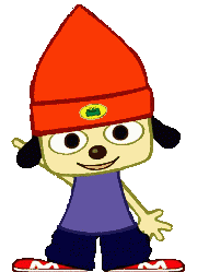 Parappa The Rapper, the iconic rapping dog, waves hello in his signature red beanie and purple shirt.