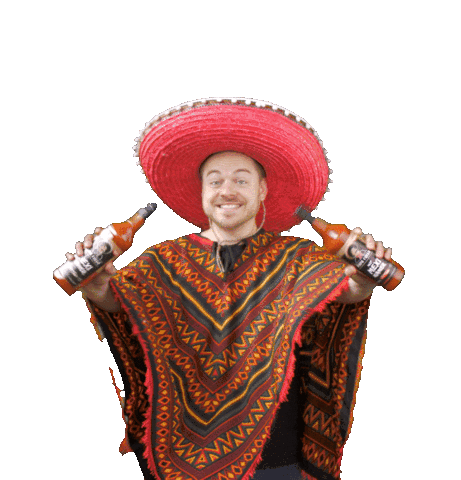 Papa Fuego, a man in a sombrero and poncho, smiles while holding two bottles of hot sauce, ready for a Mexican-themed party.