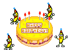 Pixel art animation featuring dancing bananas in party hats around a 'Happy Birthday' cake, celebrating with a 'Peanut Butter Jelly Time' vibe.