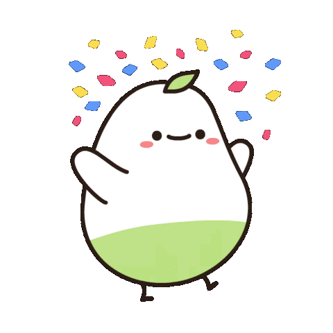 A cheerful, plump white character with a green base and leaf celebrates as colorful confetti rains down, perfect for congratulations.