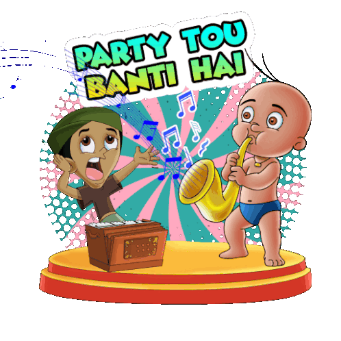 Dholu plays saxophone while Raju sings and plays keyboard, celebrating with 'Party Toh Banti Hai' vibes from Chhota Bheem.
