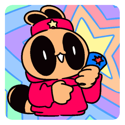 A cute raccoon-like character in a red outfit celebrates with a party popper, releasing colorful confetti against a vibrant background.