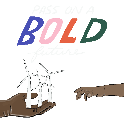 Hands exchange windmills under the message 'Pass On A Bold Future', symbolizing clean energy and sustainability.