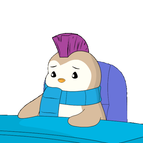 A worried cartoon penguin with a mohawk and scarf looks stressed, then suddenly faints and disappears from view.