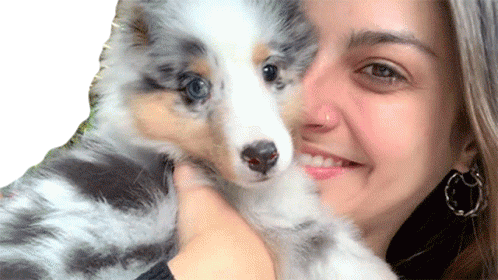 Nah Cardoso sorrindo e abraçando um adorável filhote de Pastor de Shetland com pelagem merle azul e olhos azuis.
