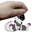 A cute animated sticker featuring a hand gently giving a headpat to Dustyfloof, the adorable protogen wearing headphones.