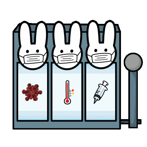 Three cute white bunnies in a slot machine with question marks, representing a game of chance or mystery.