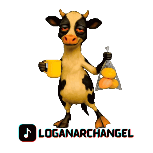 a cartoon cow holding a cup of coffee and a bag of oranges says loganarchangel