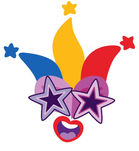 A vibrant, cartoonish jester's face with star glasses, a festive hat, and musical notes, perfect for the Patras Carnival.