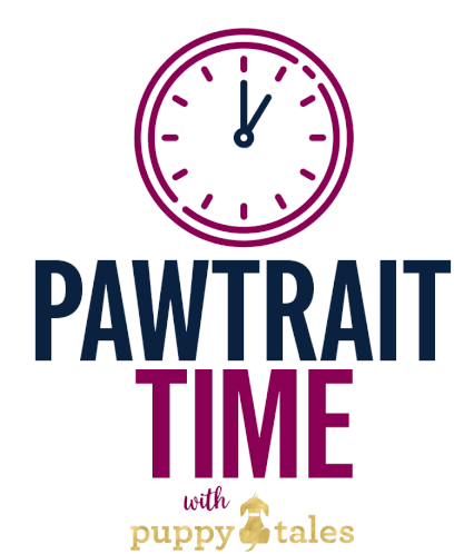A graphic logo for 'Pawtrait Time with Puppy Tales' featuring a clock icon, perfect for pet photography enthusiasts.
