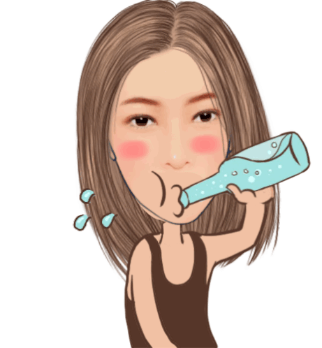 A cartoon woman spits out water in shock, reacting to being broke on payday, a humorous and relatable moment.
