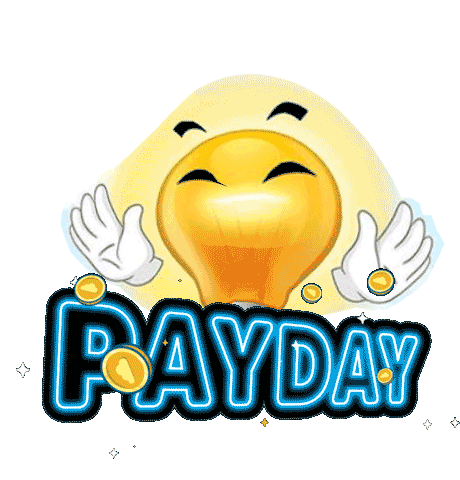 A cheerful animated sticker featuring a happy light bulb character celebrating payday with glowing text and coins.
