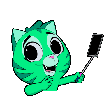 A cheerful green cat character from Pet City Mania, holding a selfie stick and posing for a picture with a wide smile.