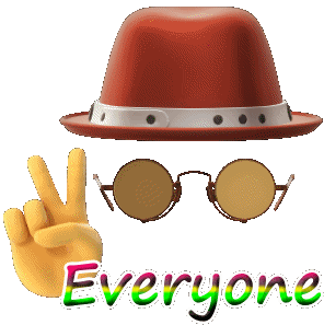 A vibrant sticker featuring a red fedora hat, round sunglasses, and a yellow peace sign hand gesture, with the word 'Everyone' in colorful letters.