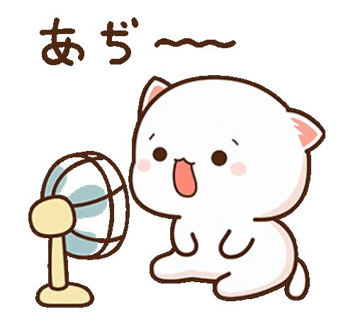 Peach Goma cat enjoys a refreshing breeze from a fan, expressing relief from the heat with a cute 'Ah, hot~' caption.