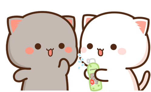Cute cartoon cats Peach and Goma share a moment of contentment, with Goma holding a green Watson bottle. Adorable and sweet.
