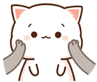 The adorable Peach Goma cat character playfully pinches its own cheeks, showing a cute and shy expression.