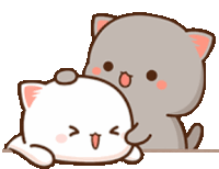 Adorable Peach Goma cats, a white one and a grey one, sharing a sweet hug. The white cat looks joyful and the grey cat is affectionately patting its head.