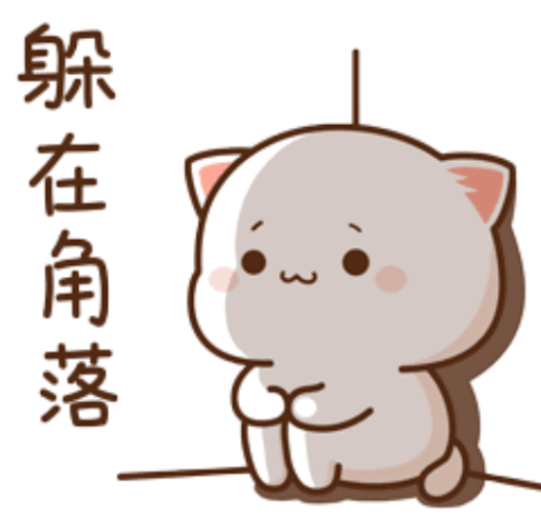 Peach Goma, a cute cat-like character, sits shyly with Chinese text "躲在角落" (Hiding in the corner) beside it.