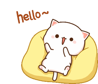 Peachcat, the cute white cartoon cat, waves hello from a yellow cushion, then closes its eyes with a sweet smile.