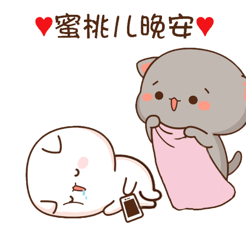 Peachcat lovingly tucks Mochi into bed, wishing a sweet goodnight. A cute animated sticker.