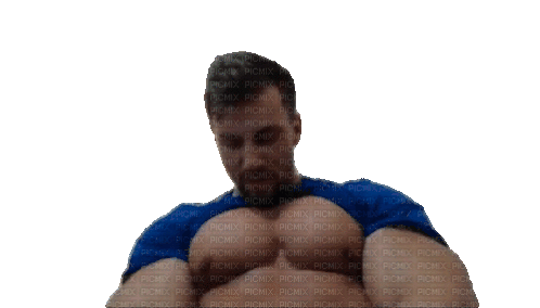 A muscular man in a blue t-shirt flexes his pectoral muscles, causing them to bounce. The background features a 'PICMIX' watermark.