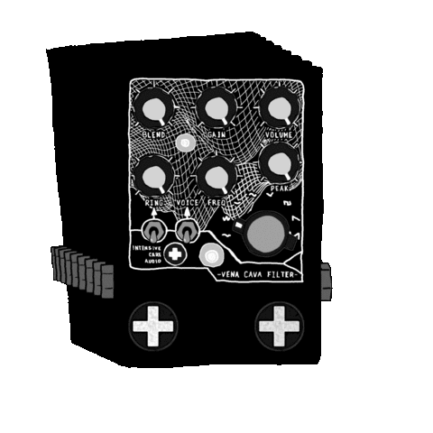 Animated sticker of the Intensive Care Audio Vena Cava Filter guitar pedal, featuring its distinctive knobs and design.