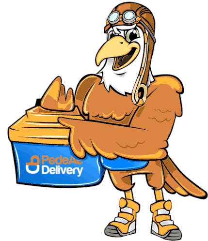 Friendly PedeAe Delivery pilot bird mascot holding a blue delivery container, ready to deliver your order.