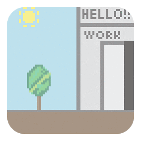 A pixel art sticker featuring a building with 'HELLO! WORK' text, a green tree, and a bright sun in a clear sky.